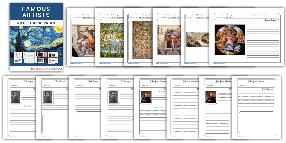 Notebooking pages, picture study pages, and art prints for nearly 30 famous artists plus blank templates to add your own.