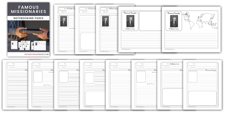 Notebooking pages for 8 famous missionaries plus blank templates to add your own.
