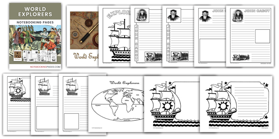 Notebooking pages for 18 famous world explorers plus additional explorer-themed blank pages.